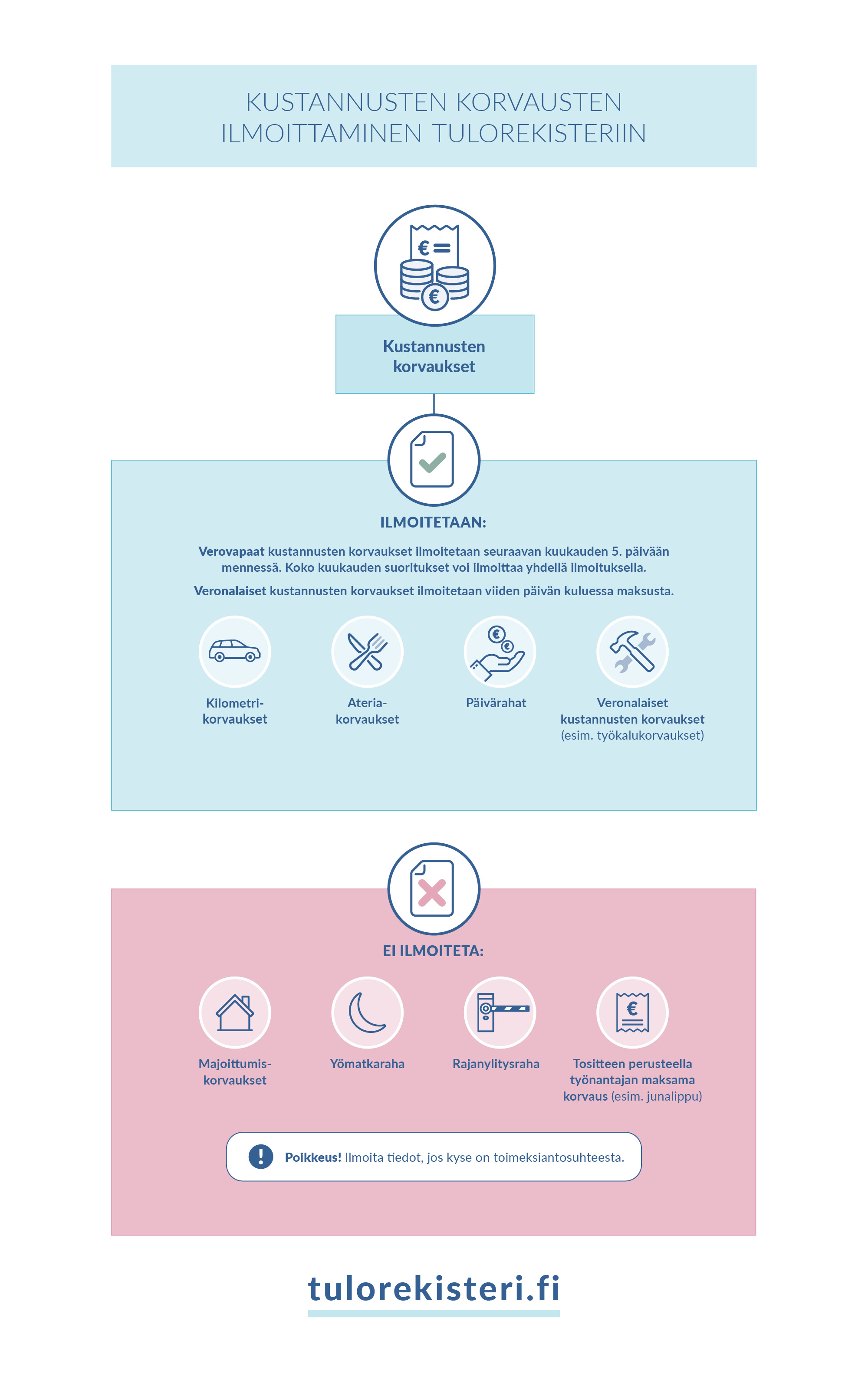 Tulorekisteriin ilmoitetaan verovapaat ja veronalaiset kustannusten korvaukset. Osa veronalaisista kustannusten korvauksista voidaan maksaa ilman ennakonpidätyksen toimittamista. Kustannusten korvauksia voivat maksaa esimerkiksi työnantajat, yhdistykset ja myös kotitaloudet.