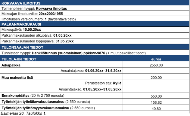 Esimerkki 4 (Useita korjauskertoja samalle ilmoitukselle): Tulonsaajalle on maksettu 2 000 euroa palkkaa, joka sisältää aikapalkkaa 1 500 euroa, ylityökorvausta 360 euroa ja iltatyökorvausta 140 euroa. Suorituksen maksaja ilmoittaa iltatyökorvauksen vahingossa iltavuorolisänä.