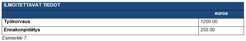 Ohjeen esimerkeissä kuvataan tietojen ilmoittamista sekä yhteissummana että eritellysti. Esimerkeissä ei esitetä kaikkia pakollisesti annettavia tietoja, vaan ainoastaan tässä ohjeessa kuvattujen erityistilanteiden ilmoittamisessa tarpeellisia tietoja. Esimerkiksi ennakonpidätyksen ilmoittamista ei ohjeisteta erikseen. Esimerkeissä käytetyt rahasummat ovat esimerkinomaisia ja sosiaalivakuutusmaksujen suuruus, ennakonpidätysprosentti sekä verovapaat kustannusten korvaukset on tarkistettava vuosittain. Ennakonpidätys määräytyy saajakohtaisen ennakonpidätysprosentin perusteella.