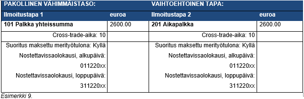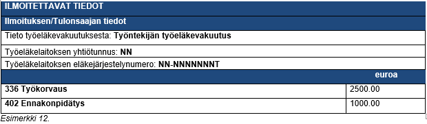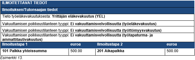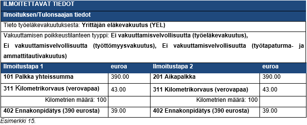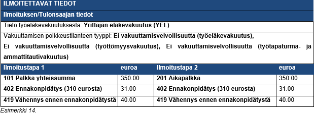 Ohjeen esimerkeissä kuvataan tietojen ilmoittamista sekä yhteissummana että eritellysti. Esimerkeissä ei esitetä kaikkia pakollisesti annettavia tietoja, vaan ainoastaan tässä ohjeessa kuvattujen erityistilanteiden ilmoittamisessa tarpeellisia tietoja. Esimerkiksi ennakonpidätyksen ilmoittamista ei ohjeisteta erikseen. Esimerkeissä käytetyt rahasummat ovat esimerkinomaisia ja sosiaalivakuutusmaksujen suuruus, ennakonpidätysprosentti sekä verovapaat kustannusten korvaukset on tarkistettava vuosittain. Ennakonpidätys määräytyy saajakohtaisen ennakonpidätysprosentin perusteella.