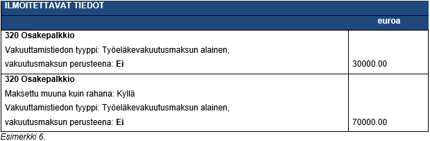 Esimerkki 6 (listattu yhtiö, yli vuoden kertymäaika): Työntekijä saa osakepalkkiona 100 000 euroa, josta rahana tulonsaajalle on maksettu 30 000 ja osakkeina 70 000. Sekä rahana että osakkeina annettu osuus ilmoitetaan tulolajilla Osakepalkkio. Se osuus osakepalkkiosta, jota ei ole annettu rahana ilmoitetaan erillisenä summana ja siihen liitetään lisätieto "Maksettu muuna kuin rahana – Kyllä". Tarvittaessa vahvistetaan tulolajin vakuuttamistiedon tyyppi. Oletuksena Osakepalkkio-tulolajissa on, ettei se ole sairaus-, työttömyys- eikä työtapaturma- ja ammattitautivakuutusmaksun alainen. Sitä vastoin tulolaji on työeläkevakuutusmaksun alainen.