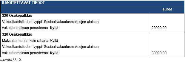 Esimerkki 5 (listattu yhtiö, alle vuoden kertymäaika): Työntekijä saa osakepalkkiona 50 000 euroa, josta rahana tulonsaajalle on maksettu 20 000 euroa ja osakkeina 30 000 euroa. Sekä rahana että osakkeina annettu osuus ilmoitetaan tulolajilla Osakepalkkio. Se osuus osakepalkkiosta, jota ei ole saatu rahana ilmoitetaan erillisenä summana ja siihen liitetään lisätieto "Maksettu muuna kuin rahana – Kyllä". Tarvittaessa vahvistetaan tulolajin vakuuttamistiedon tyyppi. Oletuksena Osakepalkkio-tulolajissa on, ettei se ole sairaus-, työttömyys- eikä työtapaturma- ja ammattitautivakuutusmaksun alainen. Sitä vastoin tulolaji on työeläkevakuutusmaksun alainen. Tässä tapauksessa maksetusta palkkiosta maksetaan sosiaalivakuutusmaksut, ja se ilmoitetaan käyttämällä vakuuttamistiedon tyyppiä.