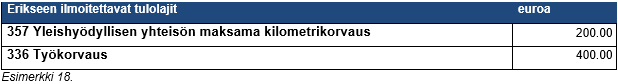 Esimerkki 18: Urheiluseura on maksanut seuraa edustavalle urheilijalle alkuvuoden aikana 2 800 euroa verovapaata kilometrikorvausta. Tämä on jo aikanaan ilmoitettu tulorekisteriin. Marraskuussa samalle urheilijalle maksetaan vielä 600 euroa kilometrikorvausta kilpailumatkasta. Urheiluseura ilmoittaa marraskuussa 200 euroa tulolajilla Yleishyödyllisen yhteisön maksaman kilometrikorvaus (357) ja 3 000 euron ylittävän veronalaisen osan 400 euroa tulolajilla Työkorvaus (336).