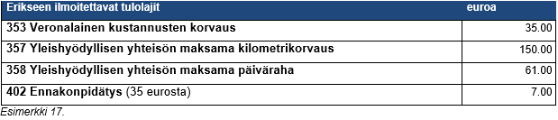 Esimerkki 17: Yleishyödyllinen yhteisö maksoi ennalta sovitusti vapaaehtoisohjaajalleen satujumppatilaisuuksien hoitamisesta verovapaata kilometrikorvausta 150 euroa. Lisäksi ohjaaja edusti yhteisöä liittokokouksessa, jonne tehdyltä matkalta yhteisö maksoi verovapaasti yhden kokopäivärahan ja yhden osapäivärahan (yhteensä 61 euroa) sekä lisäksi junaliput ja hotelliyöpymisen. Yhteisö ilmoittaa tulorekisteriin kilometrikorvauksen ja päivärahat. Julkisen liikenteen matkalippua sekä majoituskorvausta ei ilmoiteta. Lisäksi vapaaehtoisohjaajalle on korvattu hänen oman puhelimensa käytöstä kuluja 35 eurolla. Vapaaehtoisen ennakonpidätysprosentti on 20 %.