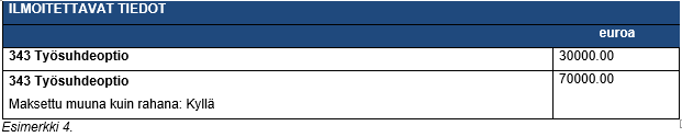 Esimerkki 4: Työsuhdeoptio toteutetaan järjestelynä, jossa työntekijä saa etua 100 000 euroa. Osakkeiden osuus on 70 000 euroa ja rahana maksettu osuus 30 000 euroa.