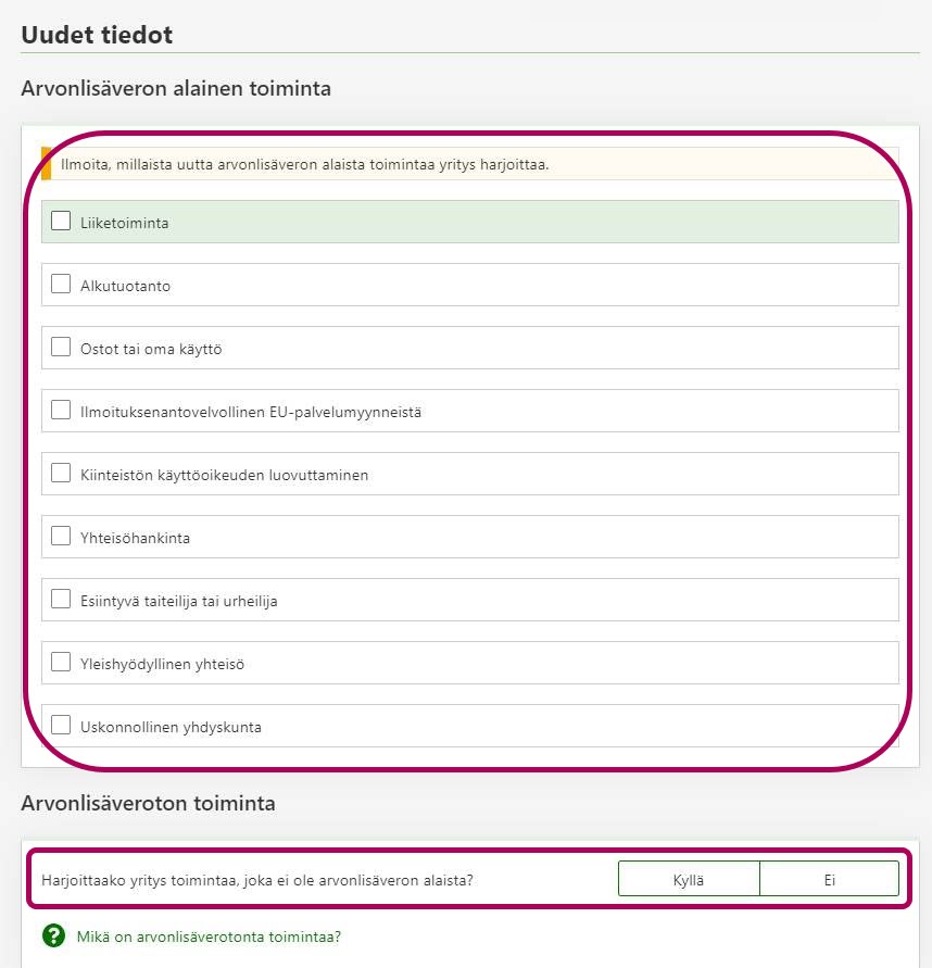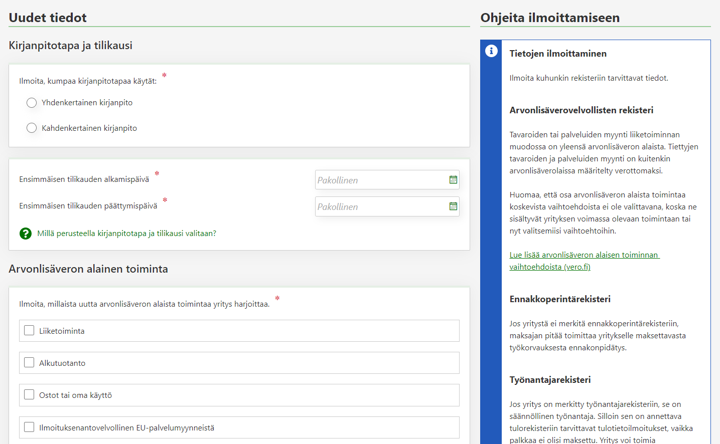 Huomaa, että voit muuttaa rekisteritietoja vasta sitten, kun yrityksellä tai yhteisöllä on Y-tunnus.