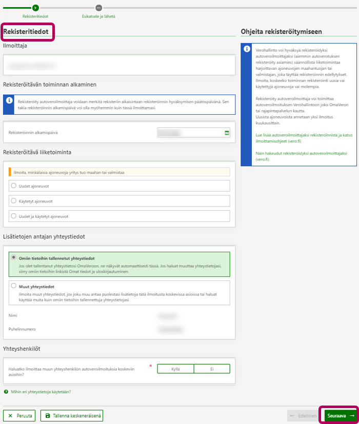Täytä Rekisteritiedot. Muuta tarvittaessa rekisteröintiin liittyvien lisätietojen antajan yhteystietoja. Jos yritys tuo maahan uusia ajoneuvoja, voit nimetä eri yhteyshenkilöt autoveroilmoituksia varten ja hintatietoilmoituksia varten. Siirry painikkeesta Seuraava vaiheeseen Esikatsele ja lähetä.