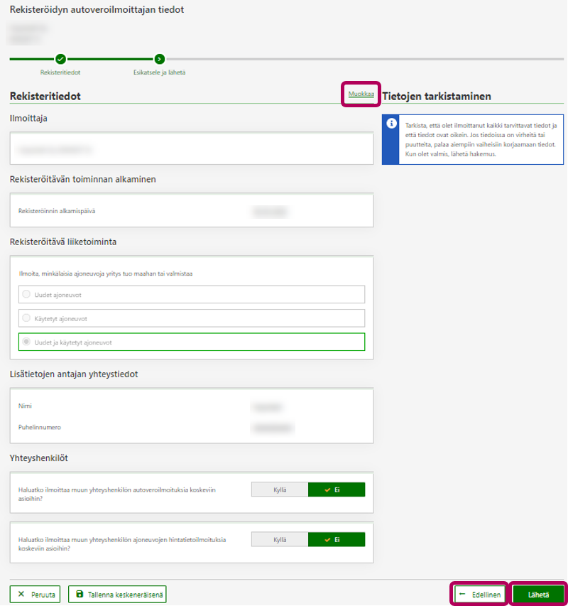 Tarkista, että antamasi tiedot ovat oikein. Tarvittaessa pääset vielä muokkaamaan tietoja painikkeesta Muokkaa tai Edellinen. Kun kaikki tiedot ovat oikein, valitse painike Lähetä.