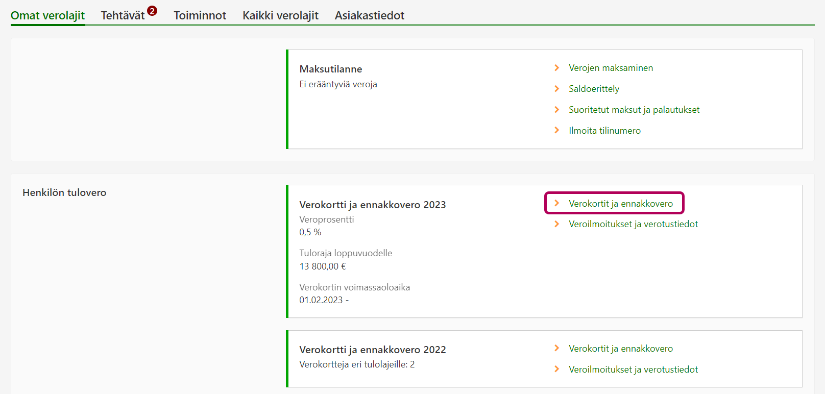 Valitse osion Henkilön tulovero kohdasta Verokortti ja ennakkovero 2026 linkki Verokortit ja ennakkovero.