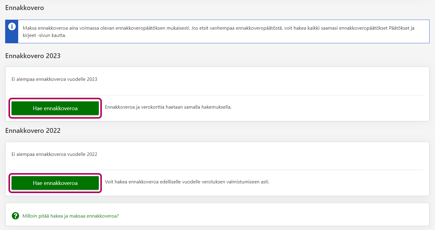 Valitse painike, jonka teksti on joko Hae ennakkoveroa tai Muuta ennakkoveroa sen mukaan, onko sinulla ennestään ennakkoveroja samalle verovuodelle.