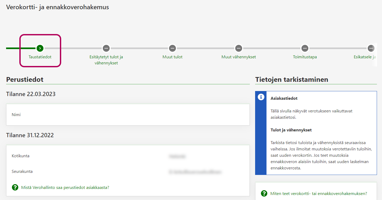 Ensimmäinen vaihe on Taustatiedot. Tässä vaiheessa näet verotukseen vaikuttavat asiakastietosi.