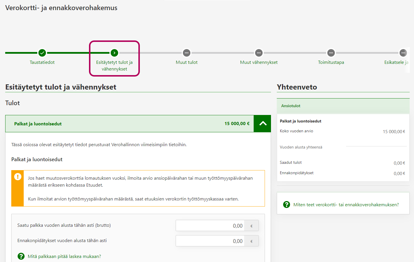 Huom.! Jos teet etätöitä ulkomaiselle työnantajalle ja haet ennakkoveroa palkkaa varten, älä muuta palkan tietoja tässä vaiheessa vaan siirry suoraan vaiheeseen Muut tulot.