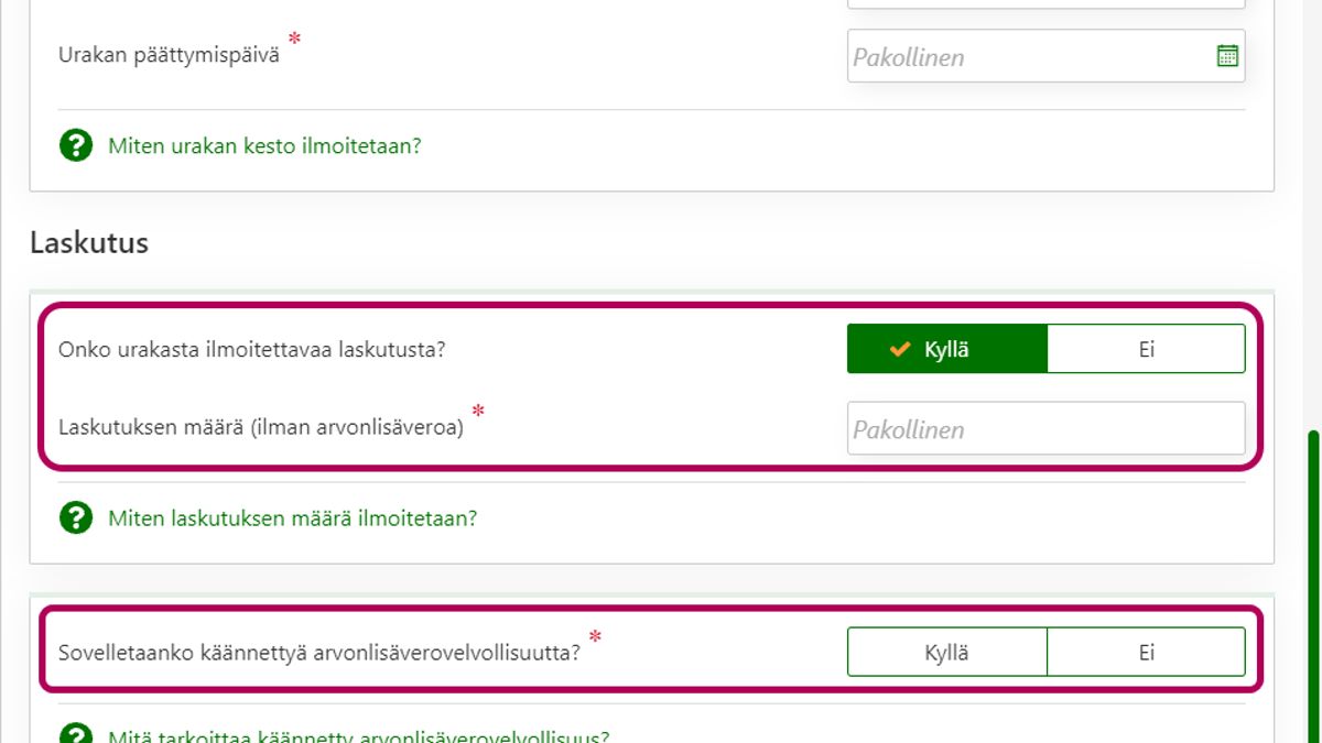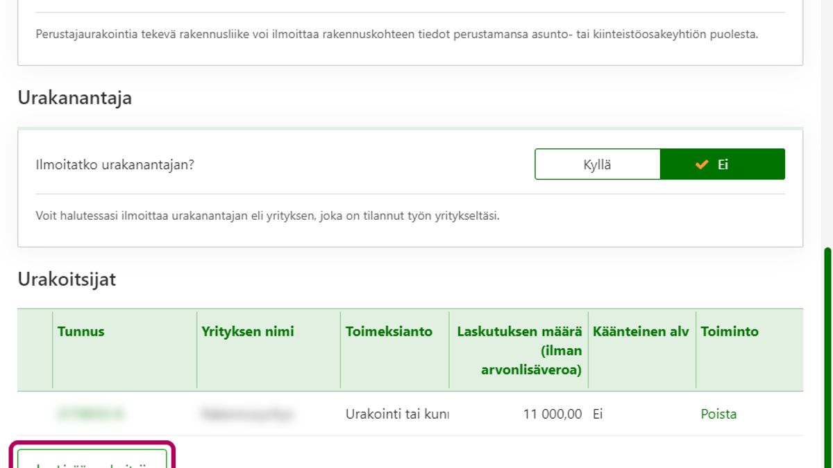 Jos ilmoitat urakkatiedot sopimuskohtaisesti, voit ilmoittaa vain yhden urakoitsijan sopimusta kohti.
