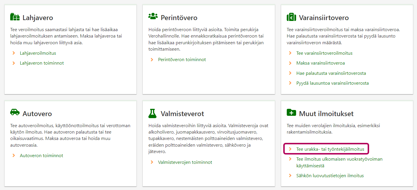 Valitse kohdasta Muut ilmoitukset linkki Tee urakka- tai työntekijäilmoitus.