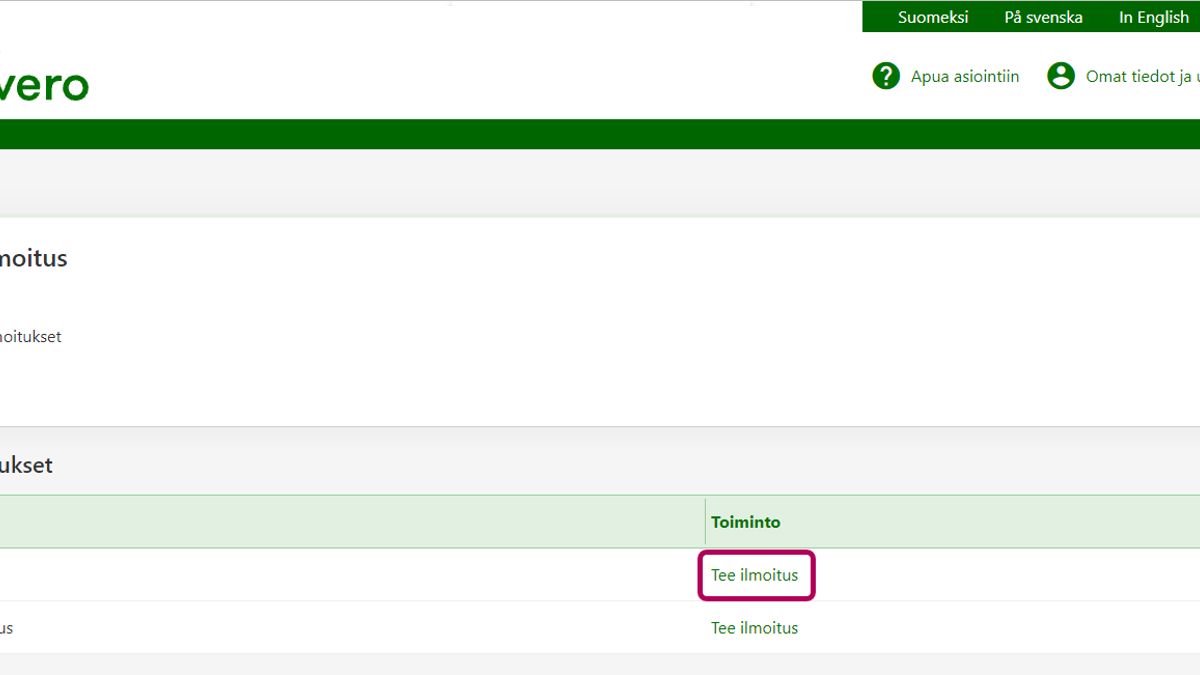 Klikkaa linkkiä Valitse ilmoitus sen kauden kohdalta, jonka tietoja haluat ilmoittaa.