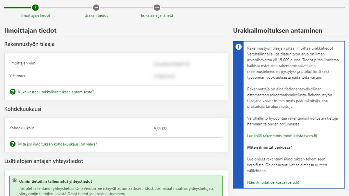 Vaihe Ilmoittajan tiedot: Muuta tarvittaessa lisätietojen antajan yhteystietoja.