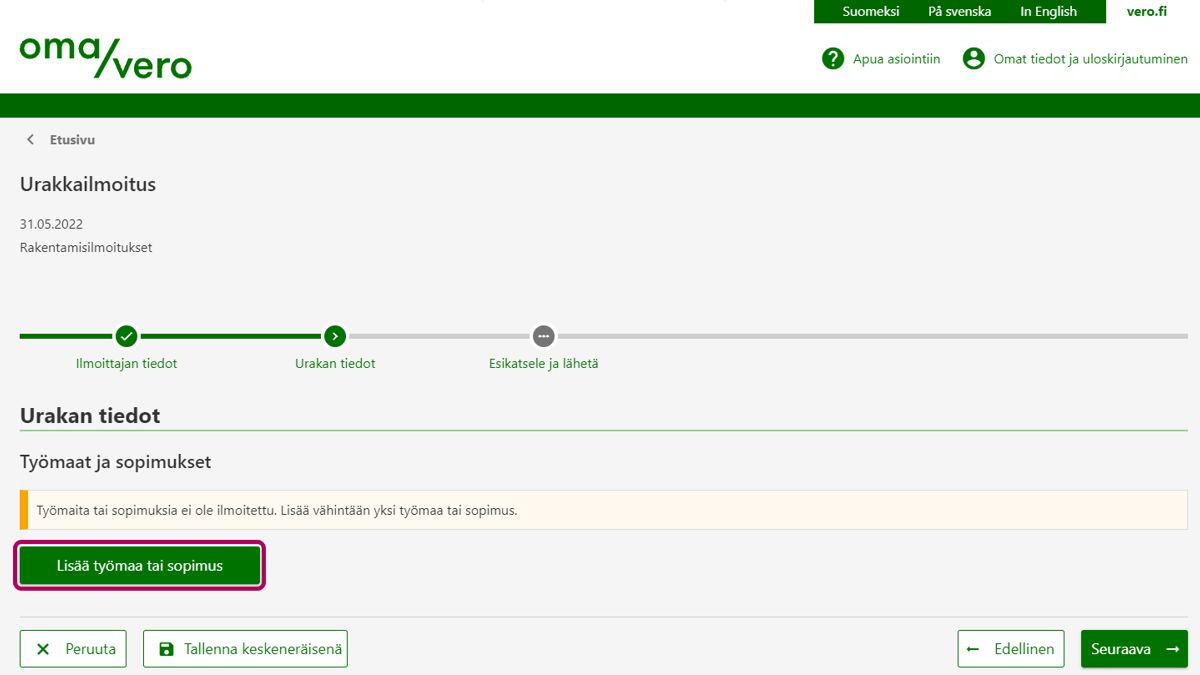 Vaihe Urakan tiedot: Anna tiedot työmaa tai urakkasopimus kerrallaan. Valitse painike Lisää työmaa tai sopimus, niin pääset ilmoittamaan yhden työmaan tai sopimuksen tiedot.