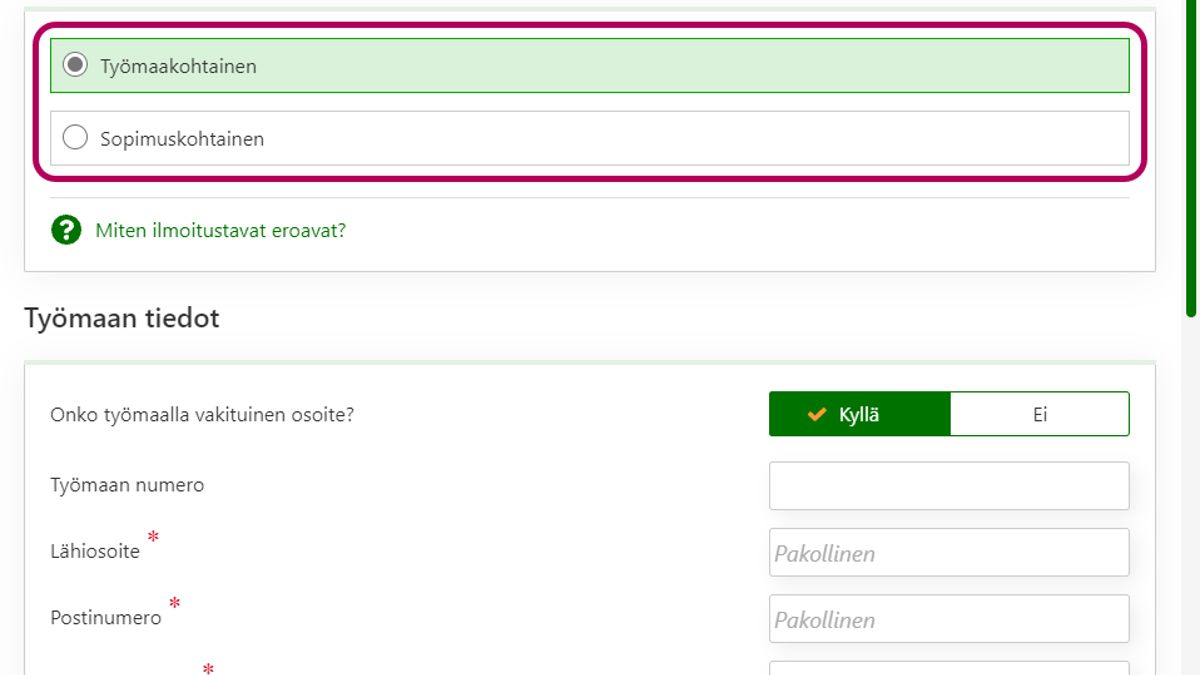 Valitse, annatko urakkatiedot työmaakohtaisesti vai sopimuskohtaisesti.