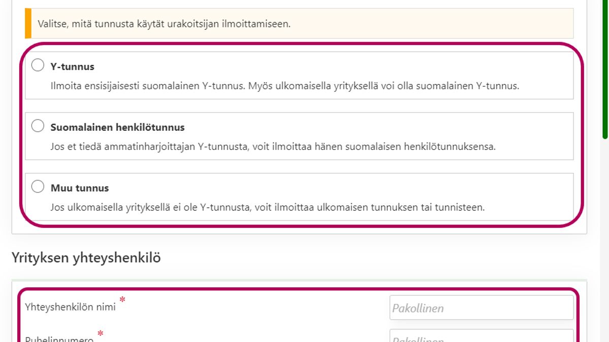 Täytä urakoitsijan Y-tunnus tai tarvittaessa jokin muu tunnusvaihtoehto. Ilmoita myös yhteyshenkilö, toimeksiannon laji ja urakan kesto. Vieritä sitten sivua alaspäin.
