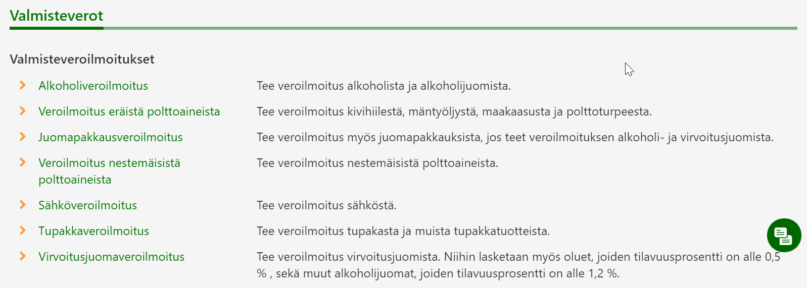 Valitse osio Valmisteverot ja sieltä linkki Valmisteverojen toiminnot.
