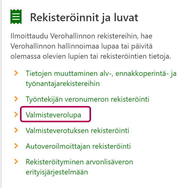 Valitse osio Rekisteröinnit ja luvat ja sieltä linkki Valmisteverolupa.