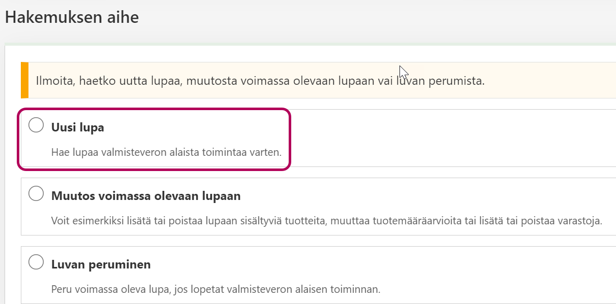 Kohdassa Hakemuksen aihe voit myös valita, haetko muutosta voimassa olevaan lupaan tai luvan peruuttamista.