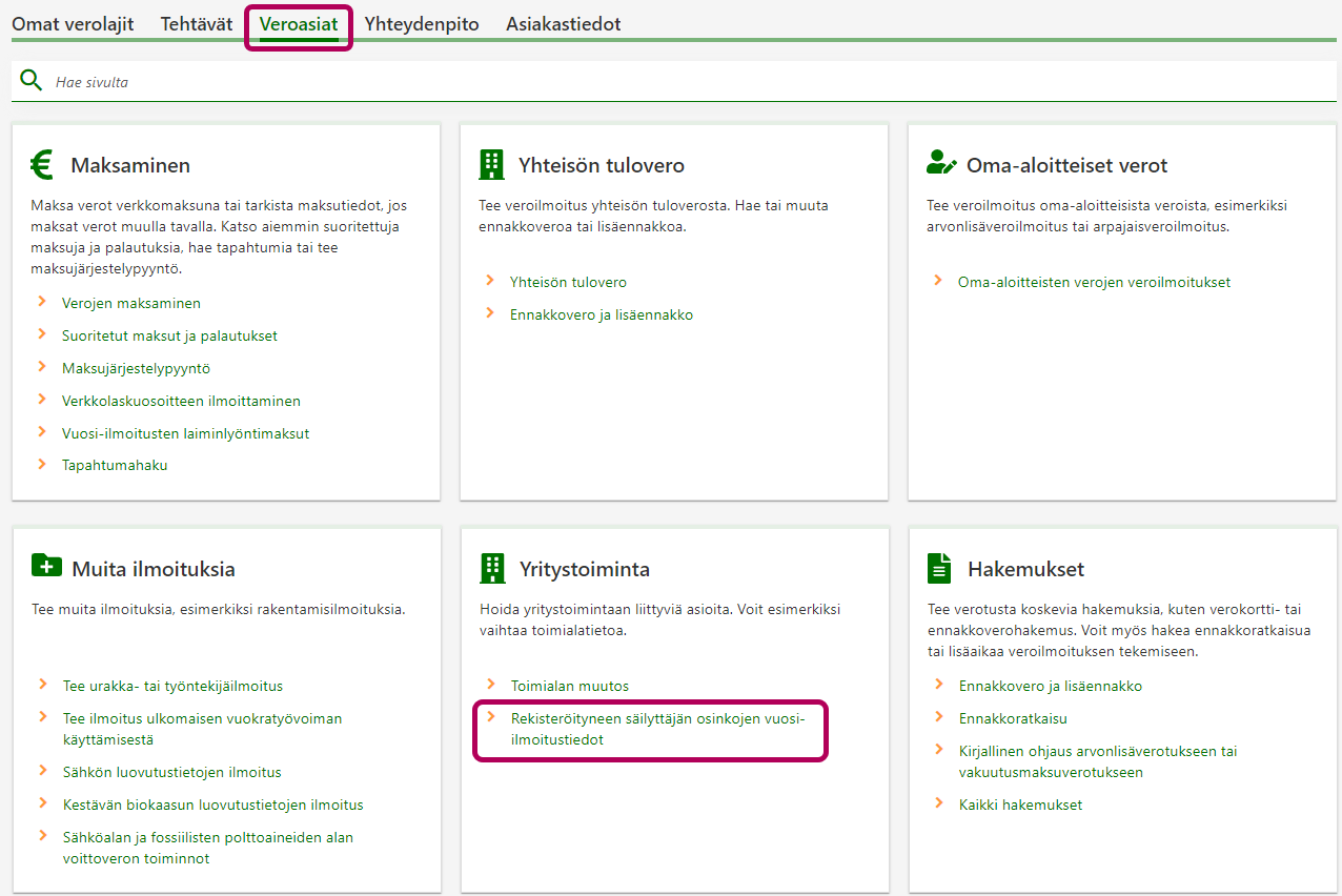 Voit tarkastella vuosi-ilmoitustietoja välilehdellä Veroasiat. Valitse linkki Rekisteröityneen säilyttäjän osinkojen vuosi-ilmoitustiedot kohdasta Yritystoiminta.