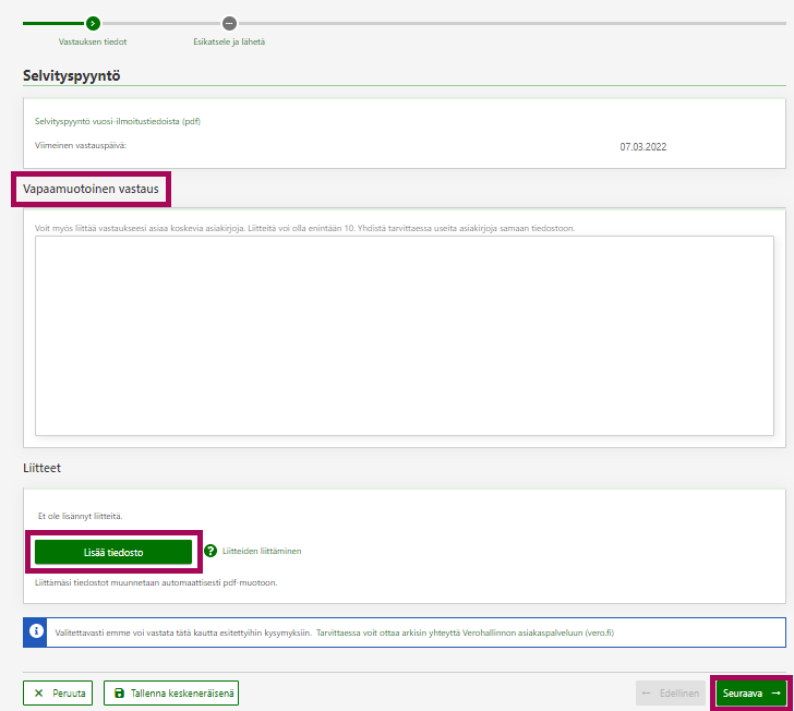 Kirjoita vapaamuotoinen vastaus, lisää tarvittaessa liitteet ja valitse painike Seuraava, jotta pääset esikatselemaan ja lähettämään vastauksesi.
