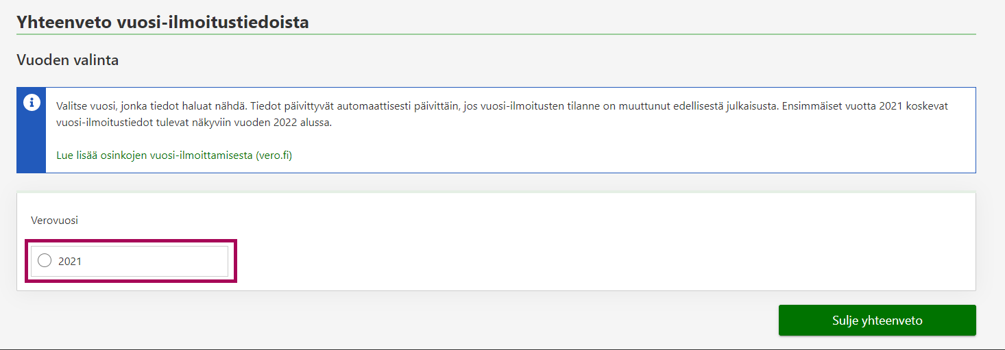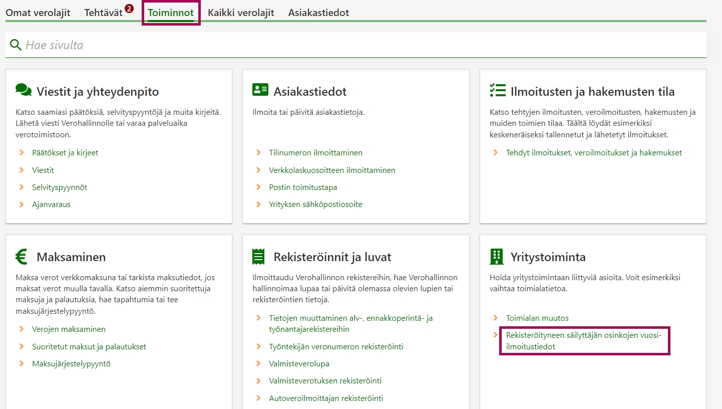 Voit tarkastella vuosi-ilmoitustietoja välilehdellä Veroasiat. Valitse linkki Rekisteröityneen säilyttäjän osinkojen vuosi-ilmoitustiedot kohdasta Yritystoiminta.