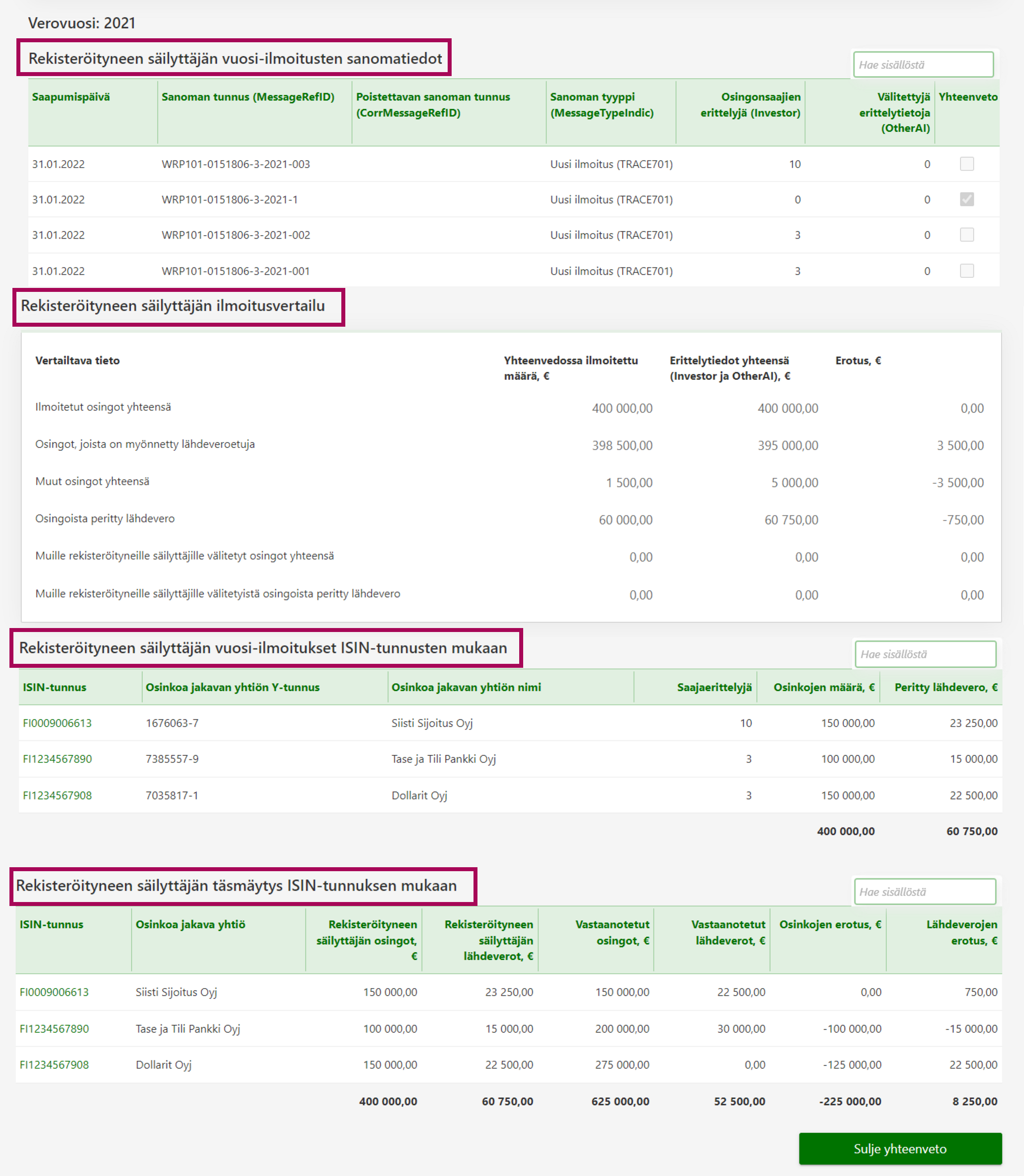 - rekisteröityneen säilyttäjän ilmoitusvertailu (yhteenveto ja erittelytiedot)