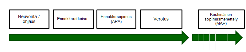 Menettelyä siirtohinnoitteluasioissa voidaan havainnollistaa seuraavilla yksinkertaistetuilla kuvilla. Ihannetilanteessa menettely päättyy neuvonnan ja ohjauksen, ennakkoratkaisun, ennakkosopimuksen tai muutoin veroilmoituksen perusteella toimitettuun verotukseen.
